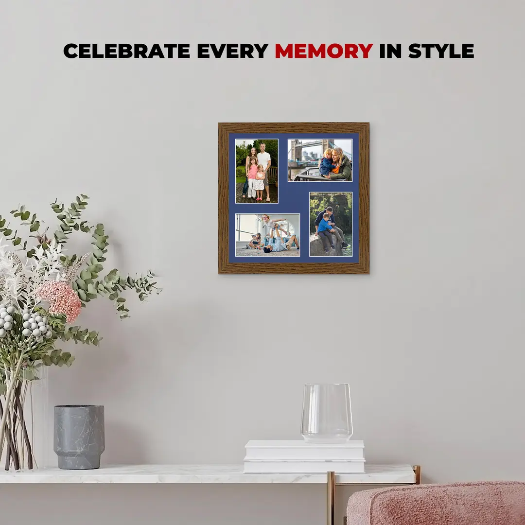 Create a clean, elegant photo display with this 6X4 (x4) collage Dark Oak frame with Blue Mount by Alison Kingsgate. Designed to fit 6X4 (x4) photos, this frame brings together your favourite memories in one beautifully arranged wall piece.