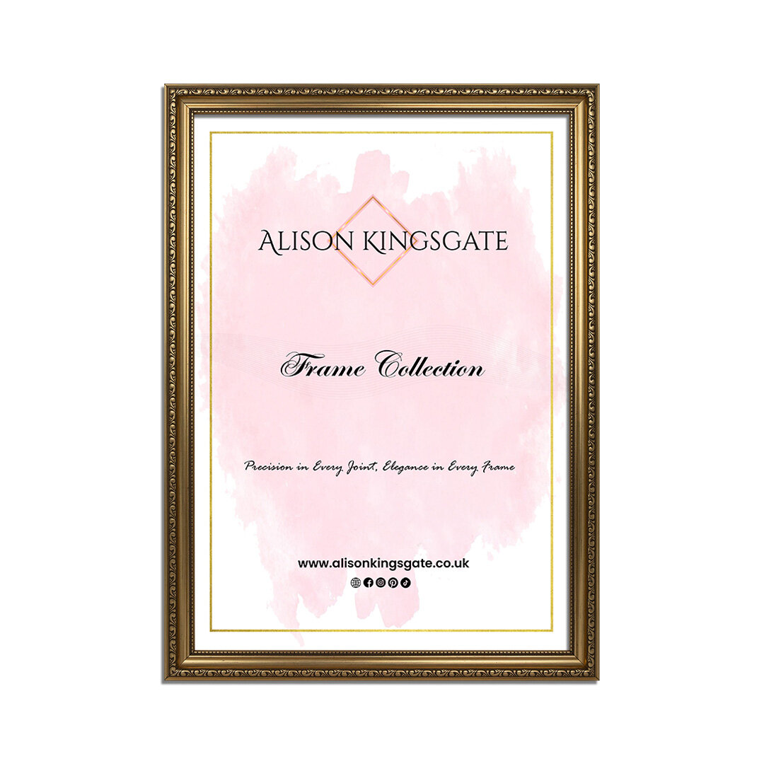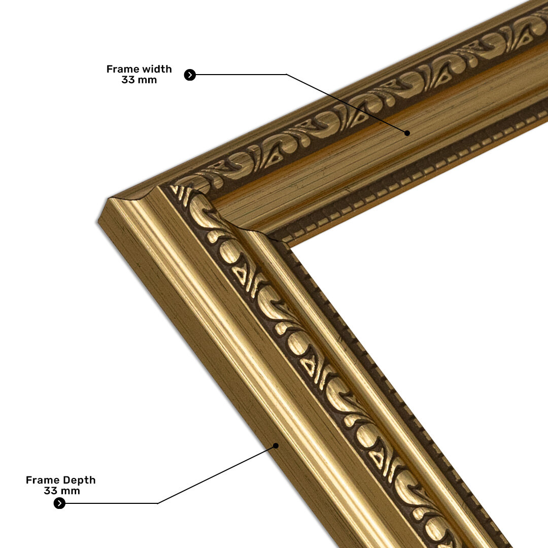 • Ornate Elegance: This gold frame features intricate detailing perfect for displaying your 36X18 artwork.• Premium Craftsmanship: Handmade from quality MDF with a luxurious gold finish.• Versatile Display: Suitable for wall mounting or tabletop use in portrait or landscape orientation.• Safety Features: Includes shatterproof Perspex front that's safer than glass.• Frame Details: Approximately 30mm wide ornate moulding with 15mm depth for a dramatic effect.• Secure Packaging: Each frame is carefully packaged to ensure it arrives in perfect condition.